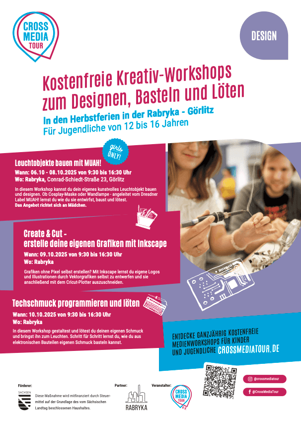 Ob Schmuck löten, Programmieren oder Masken designen – in den Herbstferien gibt es in der Rabryka in Görlitz spannende Angebote nur für Jugendliche von 12 bis 16 Jahren. Der CrossMedia Tour e.V. lädt zu drei kostenfreien Einsteiger-Workshops ein, die medienpädagogisch begleitet werden und Technik spielerisch mit Kreativität verbinden.